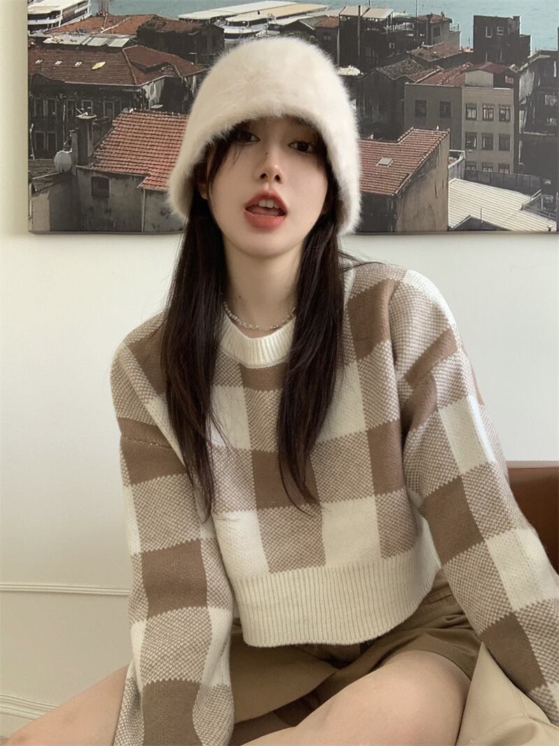 【送料無料】 トップス ニット セーター ショート ショート丈 長袖 クルーネック かわいい 大人可愛い きれいめ シンプル カジュアル おしゃれ お洒落 レトロ こなれ感 ラブリー キュート 主役級 存在感 柄 チェック柄 秋 冬 10代 20代 30代 レディース 女性用 学生 通学 デート お出かけ 女子会 休日 旅行 着回し 普段使い 韓国 韓国系 オルチャン ファッション コーデ スタイル モテ トレンド 流行 インスタ映え ワンサイズ フリーサイズ ブルー カーキ