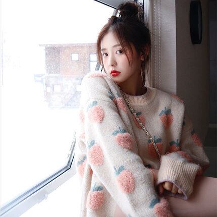【送料無料】 トップス ニット 袖あり 長袖 ラウンドネック 甘め かわいい 大人可愛い きれいめ カジュアル おしゃれ お洒落 レトロ こなれ感 ラフ ラブリー キュート ガーリー 個性的 主役級 存在感 フェミニン 柄 イチゴ ピーチ 秋 冬 10代 20代 学生 通学 デート お出かけ 休日 着回し 普段使い 重ね着 韓国 韓国系 オルチャン ファッション コーデ スタイル モテ トレンド 流行 インスタ映え ゆったり ゆる ワンサイズ フリーサイズ