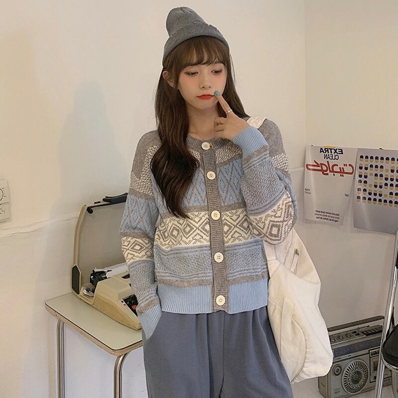 くすみカラーにレトロな幾何学模様がかわいいニットカーディガン