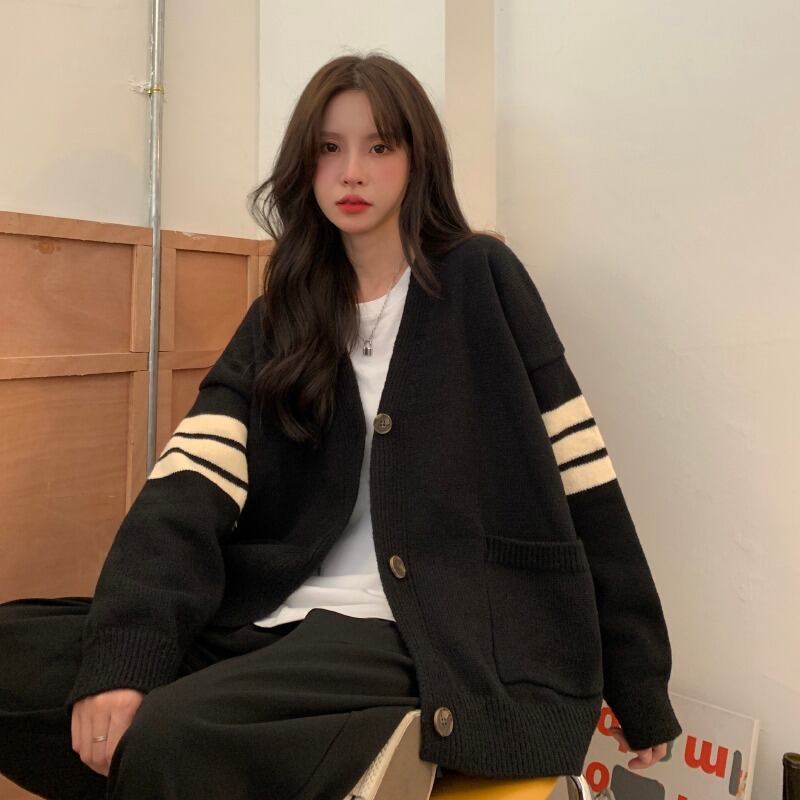 【送料無料】 トップス カーディガン ニットカーディガン ライン 3本ライン 長袖 Vネック かわいい 大人可愛い シンプル カジュアル 大人 おしゃれ 大人女子 こなれ感 ラフ スポーティー ストリート ガーリー 個性的 主役級 存在感 抜け感 秋 冬 10代 20代 30代 レディース 女性用 学生 通学 デート お出かけ 女子会 お泊まり 休日 イベント 旅行 着回し 重ね着 普段使い お揃い 双子 韓国 韓国系 オルチャン 楽ちん モテ トレンド 流行 ワンサイズ フリーサイズ 黒 ブラック
