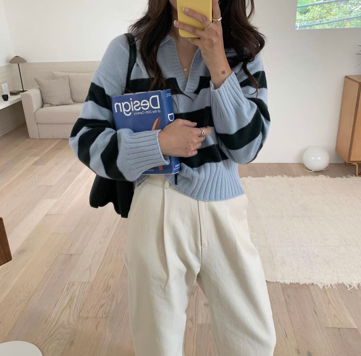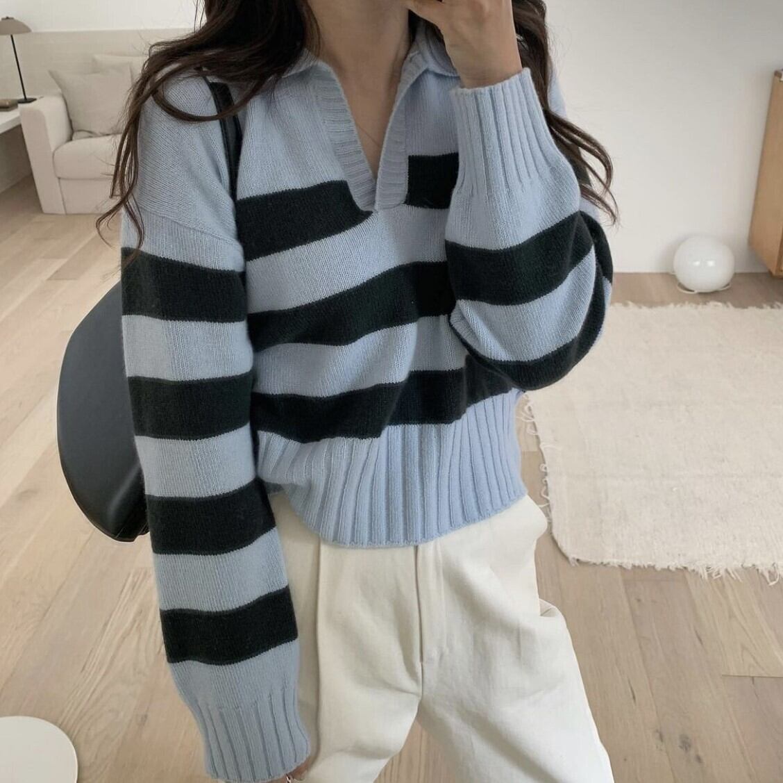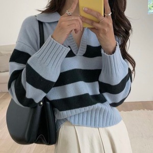 【送料無料】 トップス ニット セーター 袖あり 長袖 襟付き かわいい 大人可愛い シンプル カジュアル おしゃれ お洒落 かっこいい こなれ感 ラフ メンズライク ルーズ 個性的 主役級 存在感 ストリート ボーダー ストライプ 秋 冬 10代 20代 30代 40代 レディース 女性用 女の子 学生 通学 デート お出かけ 女子会 休日 旅行 着回し 普段使い 韓国 韓国系 オルチャン ファッション コーデ スタイル モテ 体系カバー インスタ映え ワンサイズ 白 ホワイト 黒 ブラック 青 ブルー