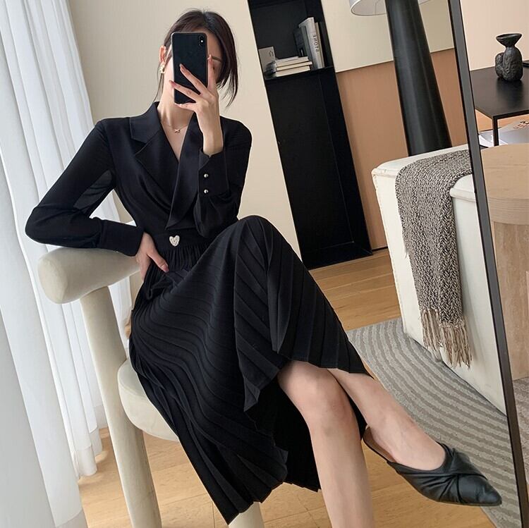 【送料無料】 ワンピース ロング ロング丈 長袖 Vネック 襟付き Aライン プリーツ ハイウエスト かわいい 大人可愛い きれいめ 大人 上品 おしゃれ お洒落 こなれ感 ラブリー クール エレガント 主役級 存在感 フォーマル 無地 秋 謝恩会 結婚式 二次会 発表会 演奏会 お呼ばれ ビジネス OL 通勤 学生 通学 デート お出かけ 休日 着回し 普段使い 韓国 韓国系 オルチャン ファッション コーデ スタイル モテ インスタ映え M L XL 黒 ブラック