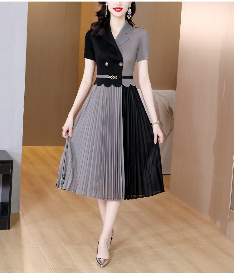 きっちり感のある襟と腰回りがすっきりとしたプリーツスカートで大人っぽいデザイン。