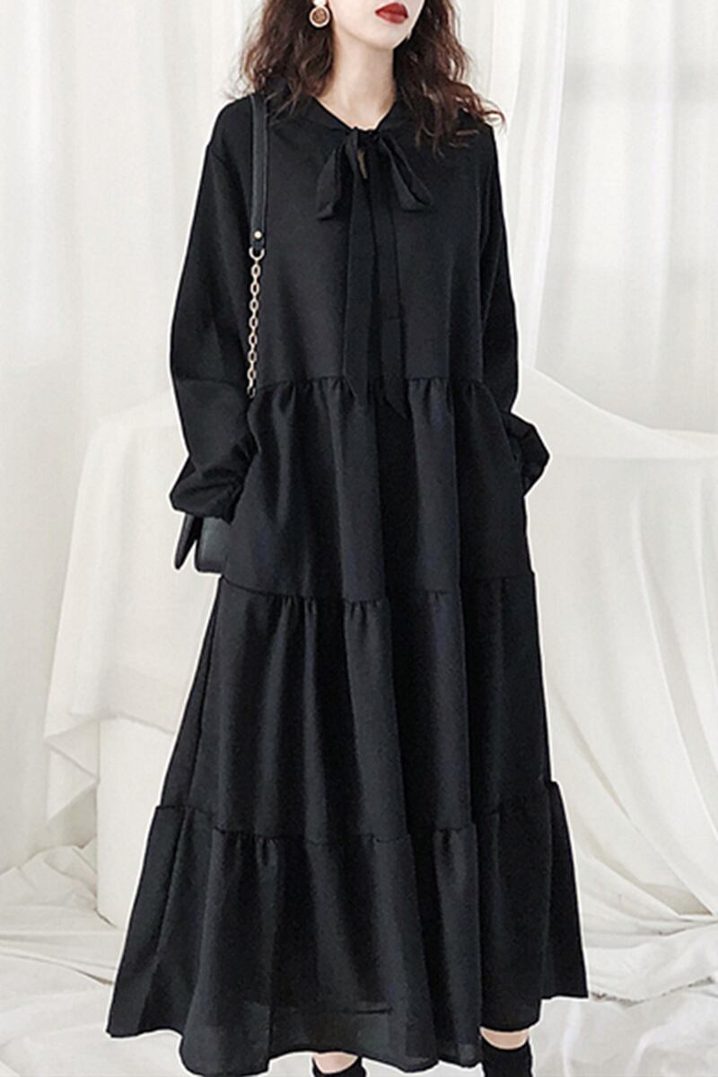 【送料無料】 ワンピース ティアードワンピース ロング ロング丈 長袖 ラウンドネック ボウタイ かわいい 大人可愛い きれいめ カジュアル おしゃれ お洒落 大人女子 こなれ感 ラブリー キュート フォーマル フェミニン 無地 秋 入学式 入園式 卒業式 卒園式 謝恩会 二次会 冠婚葬祭 10代 20代 30代 40代 レディース 女性用 デート お出かけ 女子会 パーティー 着回し 普段使い 韓国 韓国系 オルチャン スタイル M L XL 2XL 3XL 4XL ゆったり 黒 ブラック