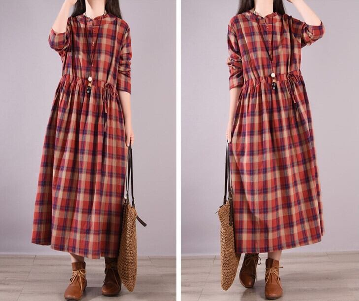 【送料無料】 ワンピース シャツワンピース ラウンドネック ロング ロング丈 長袖 ギャザー かわいい 大人可愛い カジュアル おしゃれ お洒落 大人女子 こなれ感 ラブリー キュート エレガント 主役級 存在感 柄 チェック柄 春 10代 20代 30代 レディース 女性用 学生 通学 デート お出かけ 女子会 休日 着回し 普段使い 韓国 韓国系 オルチャン ファッション コーデ スタイル モテ 体系カバー プチプラ トレンド 流行 インスタ映え M L XL 2XL ブルー レッド ブラウン