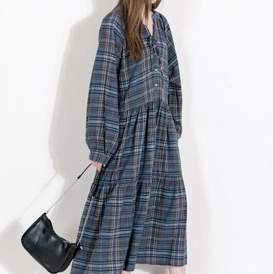 【送料無料】 ワンピース シャツワンピース Vネック ロング ロング丈 長袖 ティアード かわいい 大人可愛い カジュアル おしゃれ お洒落 大人女子 こなれ感 ラブリー キュート エレガント 主役級 存在感 柄 チェック柄 春 10代 20代 30代 レディース 女性用 学生 通学 デート お出かけ 女子会 休日 着回し 普段使い 韓国 韓国系 オルチャン ファッション コーデ スタイル モテ 体系カバー プチプラ トレンド 流行 インスタ映え S M ネイビー 紺 ゆったり ゆる