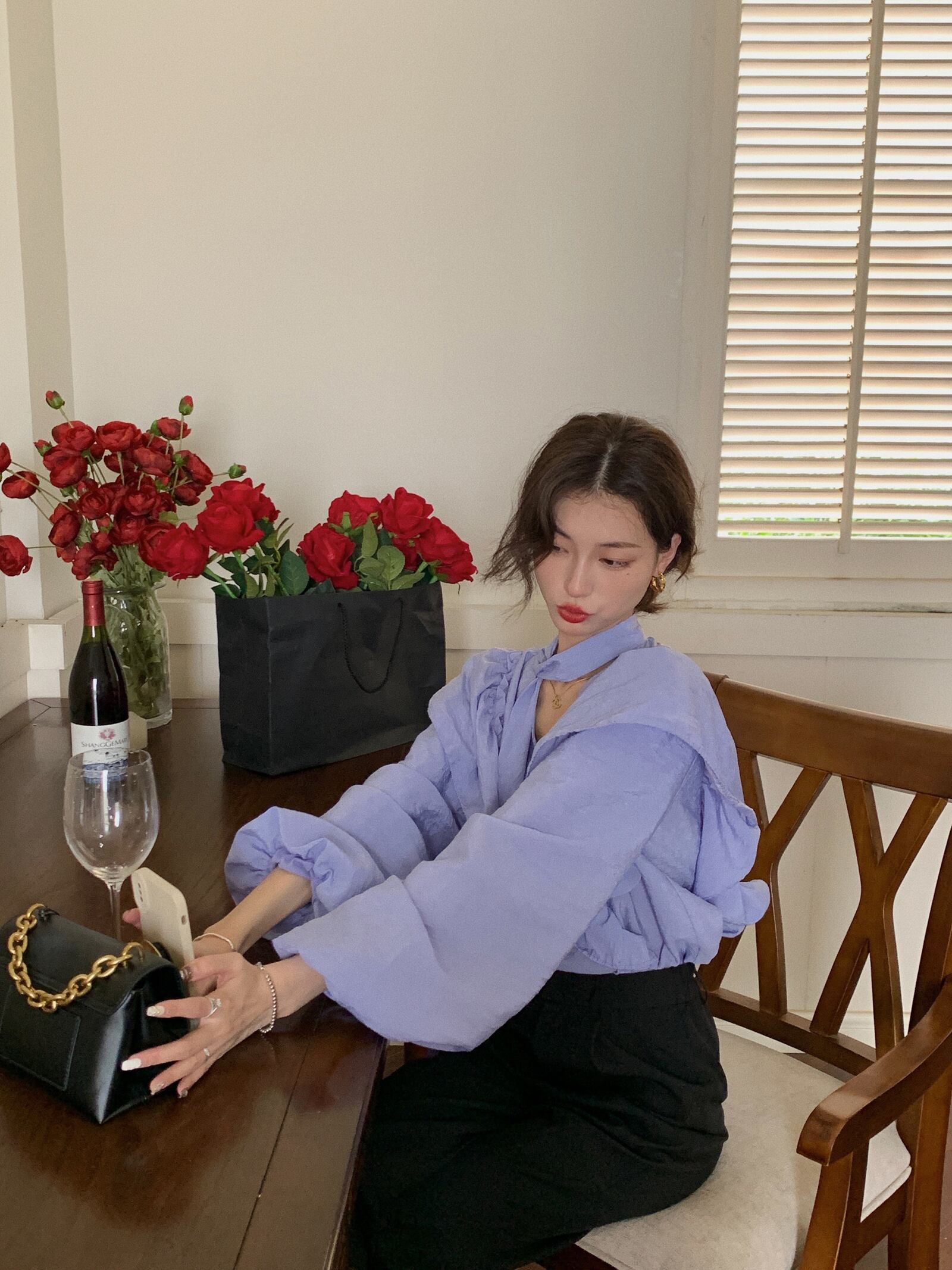 【送料無料】 トップス シャツ ブラウス カットソー 長袖 袖あり ボリューム袖 Vネック フリル リボン かわいい 大人可愛い きれいめ おしゃれ お洒落 こなれ感 ラブリー キュート ガーリー エレガント 主役級 存在感 フェミニン 無地 春 秋 10代 20代 30代 レディース 女性用 学生 通学 デート お出かけ 女子会 休日 着回し 普段使い 韓国 韓国系 オルチャン ファッション コーデ スタイル モテ インスタ映え XS S M L 紫 パープル