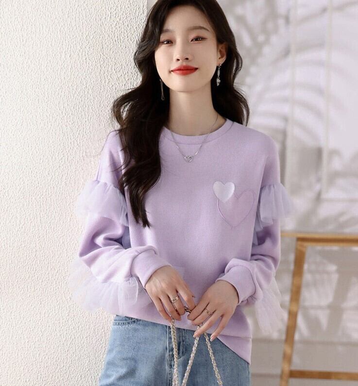 【送料無料】 トップス セーター ニット カットソー トレーナー 長袖 袖あり ラウンドネック ハート フリル かわいい 大人可愛い きれいめ おしゃれ お洒落 こなれ感 ラブリー キュート ガーリー エレガント 主役級 存在感 フェミニン 無地 春 秋 10代 20代 30代 レディース 女性用 学生 通学 デート お出かけ 女子会 休日 着回し 普段使い 韓国 韓国系 オルチャン ファッション コーデ スタイル モテ 流行 トレンド インスタ映え ゆる ゆったり S M L XL 2XL パープル 紫