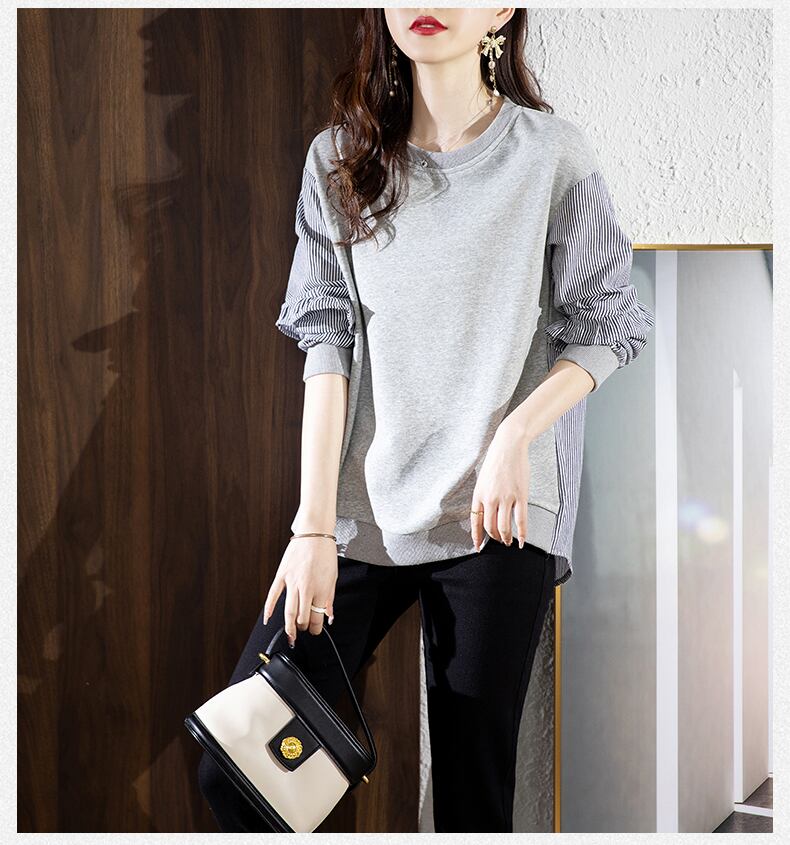 無地とストライプのコントラストがオシャレなレイヤード風トップスです。