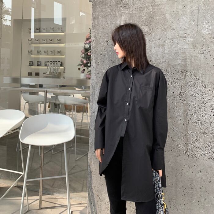 【送料無料】 トップス シャツ ミディアム丈 長袖 アシンメトリー 大人可愛い シンプル カジュアル 大人 おしゃれ お洒落 かっこいい こなれ感 ラフ メンズライク 個性的 クール 無地 秋 10代 20代 30代 レディース 女性用 学生 通学 デート お出かけ 女子会 休日 着回し 普段使い 重ね着 韓国 韓国系 オルチャン ファッション コーデ スタイル トレンド 流行 インスタ映え S M L ゆったり オーバーサイズ 白 ホワイト 黒 ブラック モノトーン