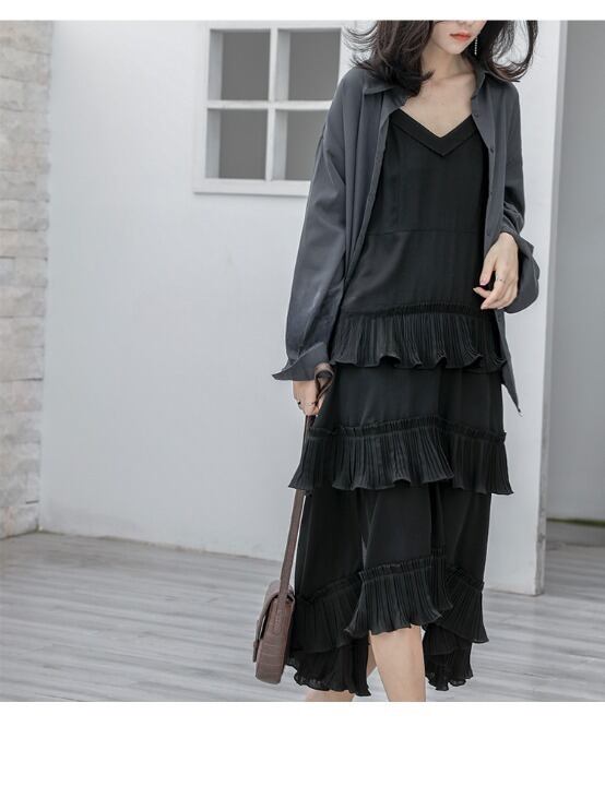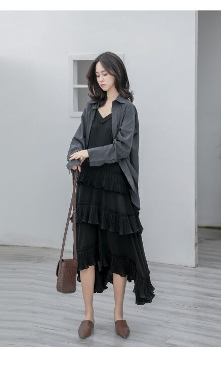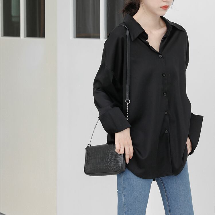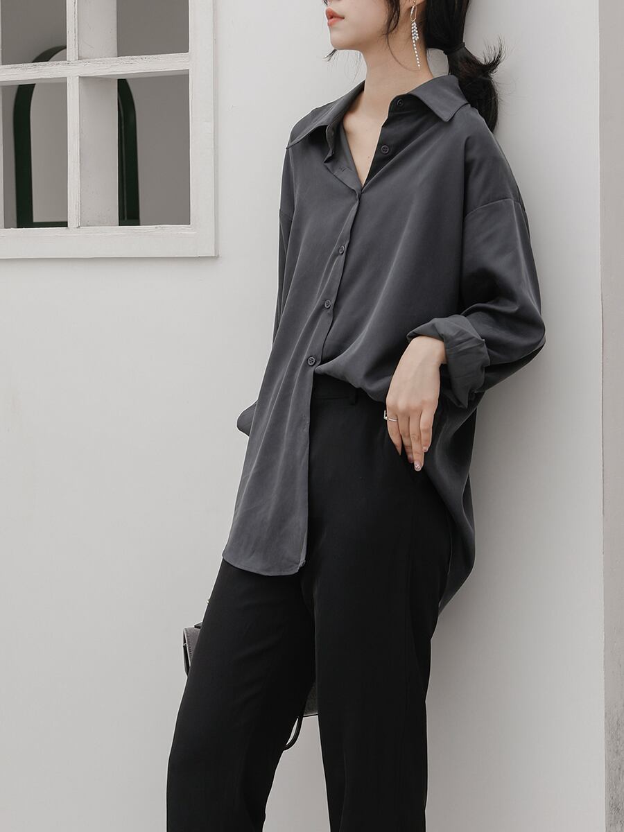 【送料無料】 トップス シャツ ミディアム丈 長袖 襟付き ルーズ 大人可愛い シンプル カジュアル 大人 おしゃれ お洒落 かっこいい こなれ感 ラフ メンズライク 個性的 クール 無地 秋 10代 20代 30代 レディース 女性用 学生 通学 デート お出かけ 女子会 休日 着回し 普段使い 重ね着 韓国 韓国系 オルチャン ファッション コーデ スタイル トレンド 流行 インスタ映え S M L ゆったり オーバーサイズ モノトーン 黒 ブラック グレー 灰色