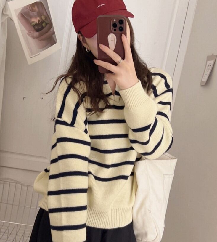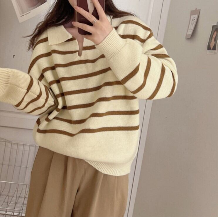 襟付きストライプボーダーニットです。