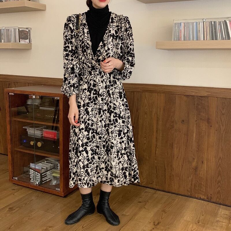 【送料無料】 ワンピース 膝下 ロング ロング丈 ハイネック フレア ハイウエスト かわいい 大人可愛い きれいめ カジュアル おしゃれ お洒落 こなれ感 ラフ セクシー エレガント 主役級 存在感 フェミニン 無地 花柄 秋 発表会 演奏会 お呼ばれ レトロ 10代 20代 30代 40代 レディース 女性用 OL 通勤 学生 通学 デート お出かけ 女子会 着回し 普段使い 韓国 韓国系 オルチャン ファッション コーデ スタイル モテ ワンサイズ 黒 ブラック
