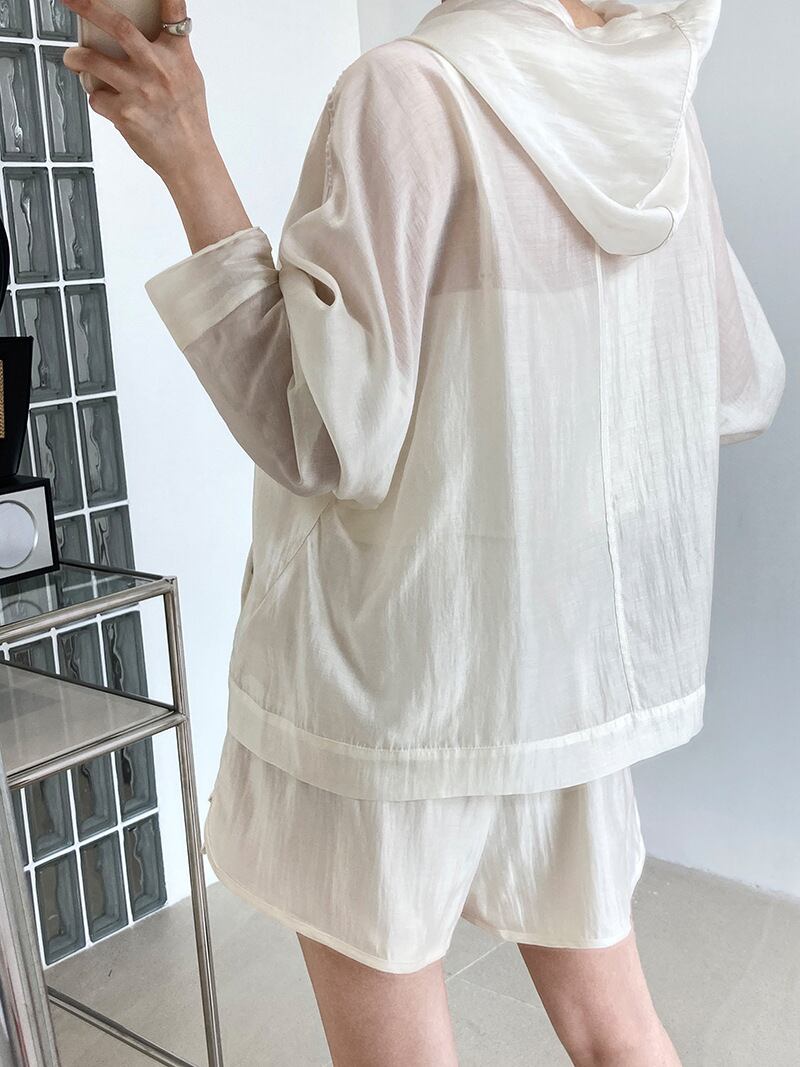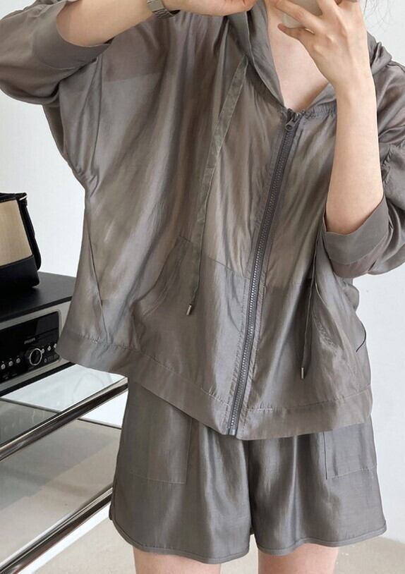 【送料無料】 セットアップ トップス パーカー ショートパンツ 長袖 フード付き ファスナー 前開き 透け感 シースルー 2点セット お得 かわいい 大人可愛い シンプル カジュアル おしゃれ お洒落 ラフ セクシー エレガント 存在感 とろみ感 抜け感 無地 夏 10代 20代 30代 レディース 女性用 お泊まり 休日 旅行 着回し 韓国 韓国系 オルチャン ファッション コーデ スタイル 楽ちん モテ 体系カバー プチプラ インスタ映え M L 灰色 グレー アプリコット