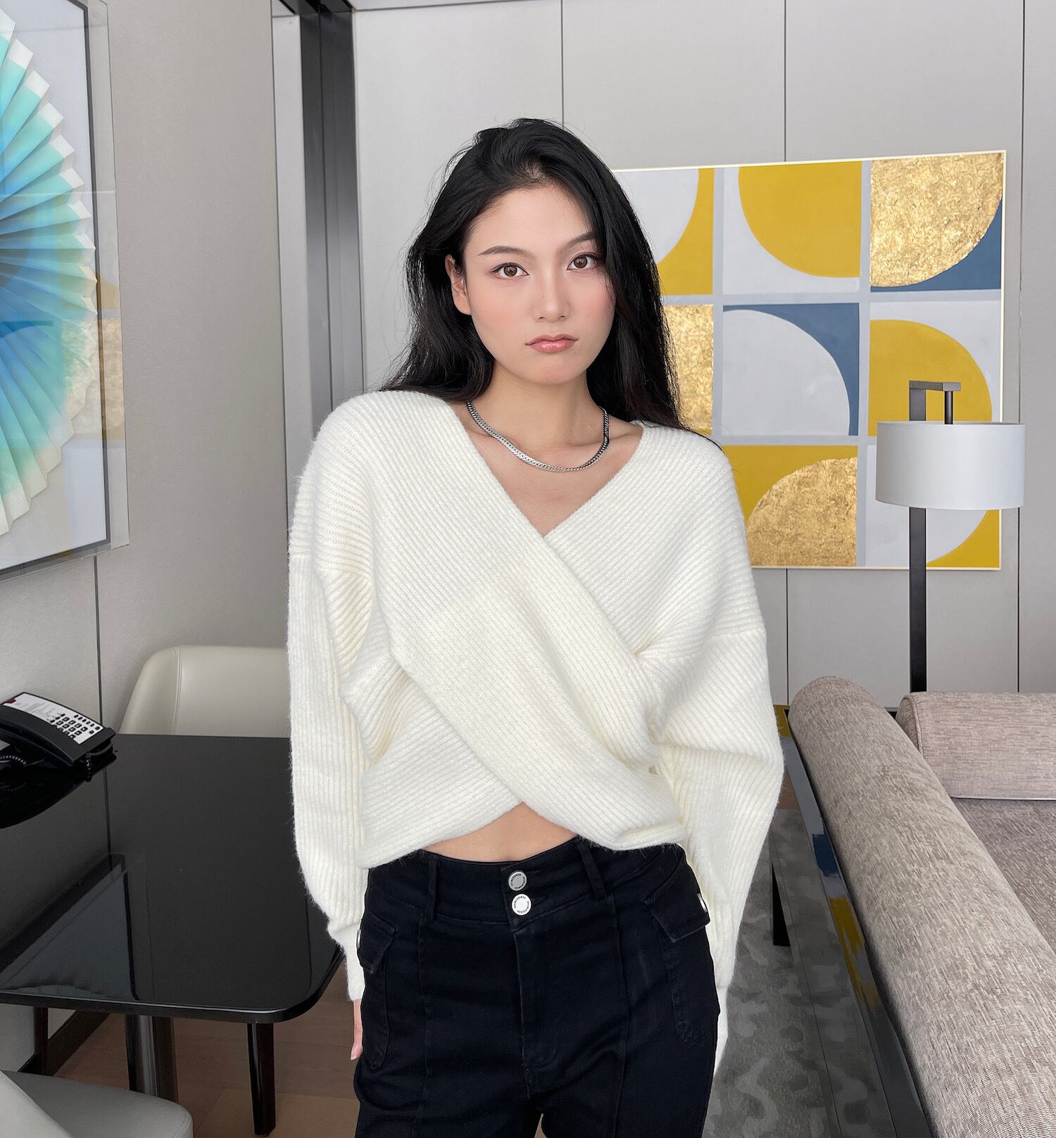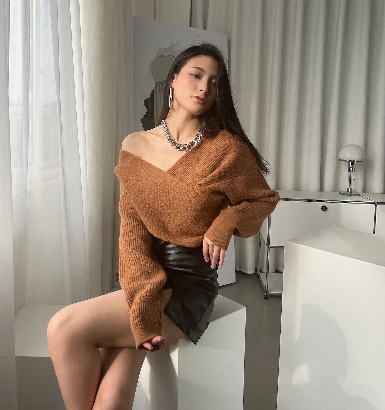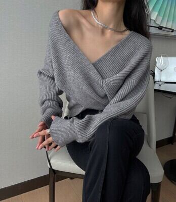 カシュクールデザインの旬なコーデが楽しめるリブニット