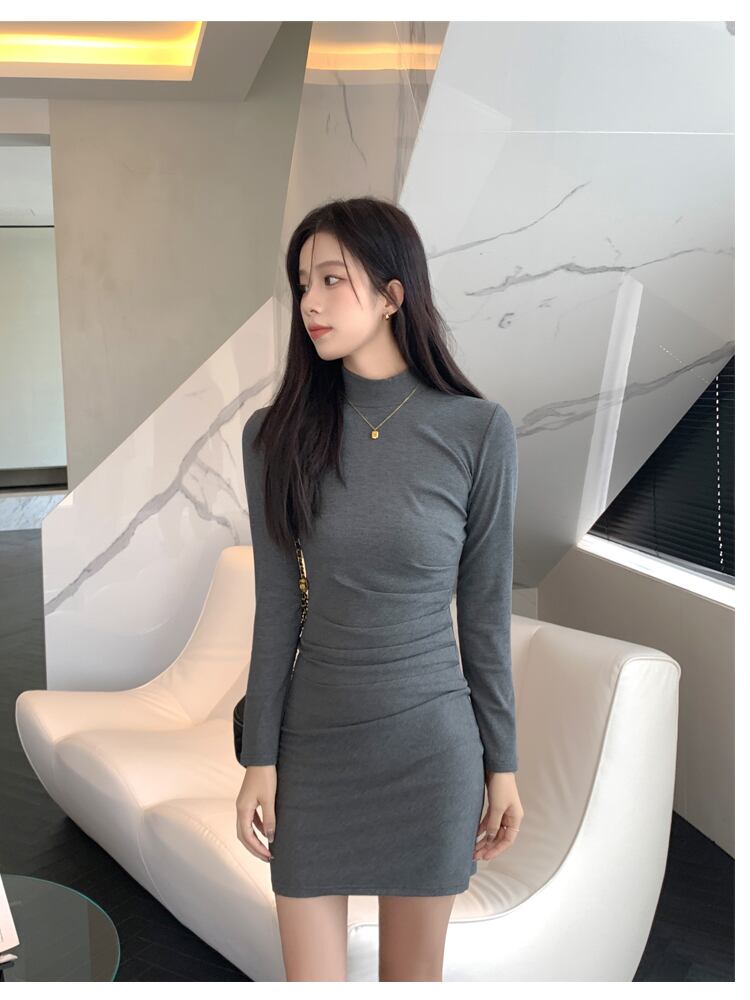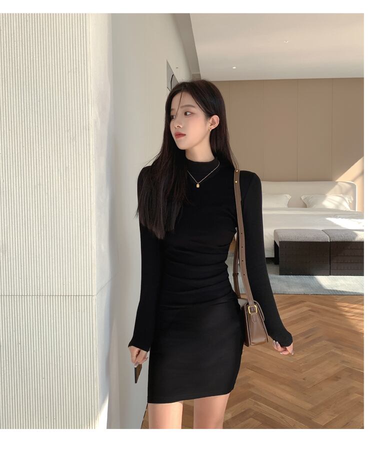 【送料無料】 ワンピース ショート ショート丈 長袖 ハイネック ハーフタートルネック スリム タイト 細身 ハイウエスト かわいい 大人可愛い きれいめ シンプル カジュアル おしゃれ お洒落 こなれ感 ラフ セクシー エレガント 主役級 存在感 無地 秋 冬 10代 20代 30代 40代 レディース 女性用 通勤 学生 通学 デート お出かけ 女子会 休日 着回し 普段使い 重ね着 韓国 韓国系 オルチャン ファッション コーデ スタイル モテ S M L XL 2XL 黒 ブラック グレー 灰色