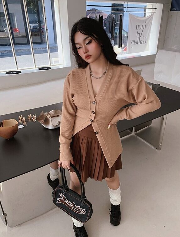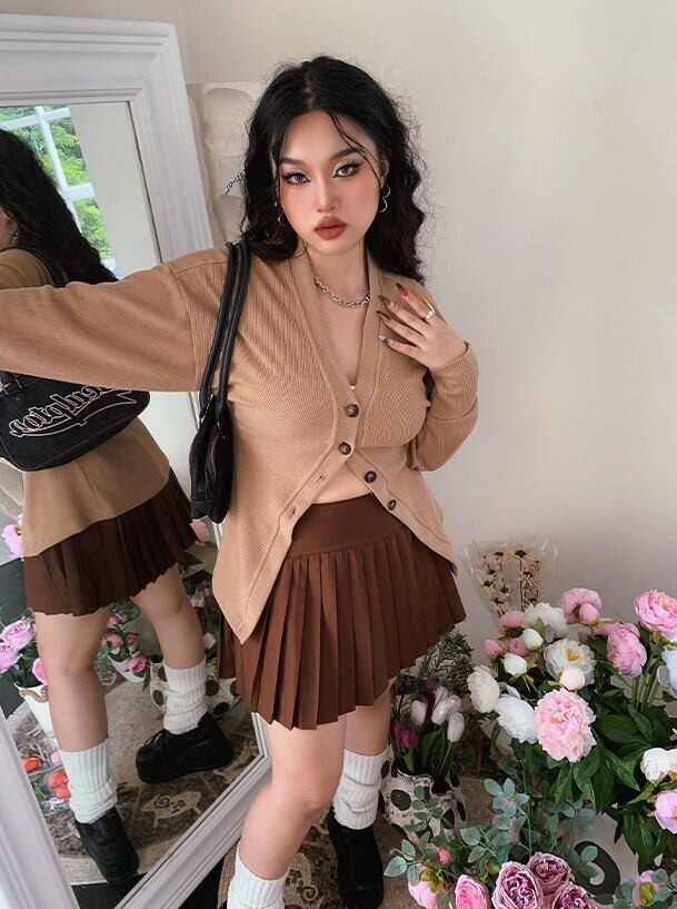 【送料無料】 トップス スカート カーディガン ミニスカート プリーツスカート ミニ ミニ丈 長袖 Vネック かわいい 大人可愛い カジュアル おしゃれ お洒落 こなれ感 ラフ ラブリー キュート 主役級 存在感 スクール 女子高生 JK ストリート 無地 秋 10代 20代 レディース 女の子 学生 通学 デート お出かけ 女子会 パーティー イベント 着回し 重ね着 韓国 韓国系 オルチャン ファッション コーデ スタイル モテ 体系カバー トレンド 流行 XL 2XL 3XL 4XL 茶色 ブラウン