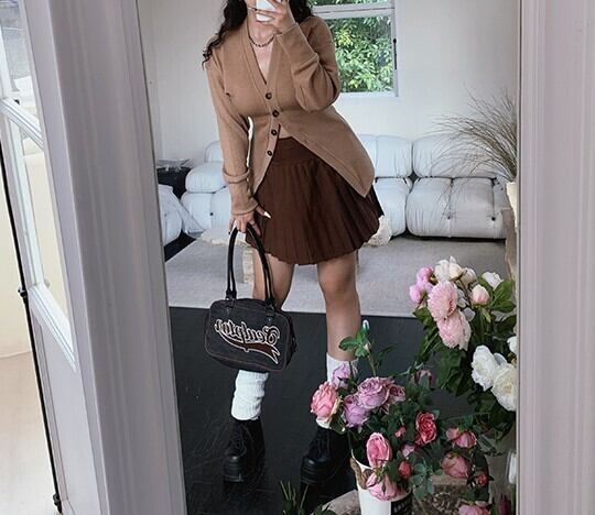 オーバーサイズのカーディガンと、プリーツミニスカートです。