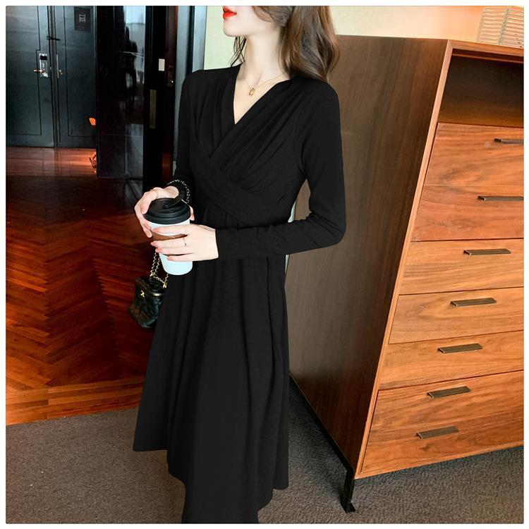 【送料無料】 ワンピース ミディアム丈 袖あり 長袖 Vネック ハイウエスト かわいい 大人可愛い きれいめ 大人 上品 おしゃれ お洒落 こなれ感 セクシー エレガント 主役級 存在感 フォーマル 無地 秋 20代 30代 40代 50代 レディース 女性用 OL 通勤 学生 通学 デート お出かけ 女子会 休日 着回し 普段使い 韓国 韓国系 オルチャン ファッション コーデ スタイル 楽ちん モテ 流行 インスタ映え S M L XL 色展開 黒 ブラック 灰色 グレー