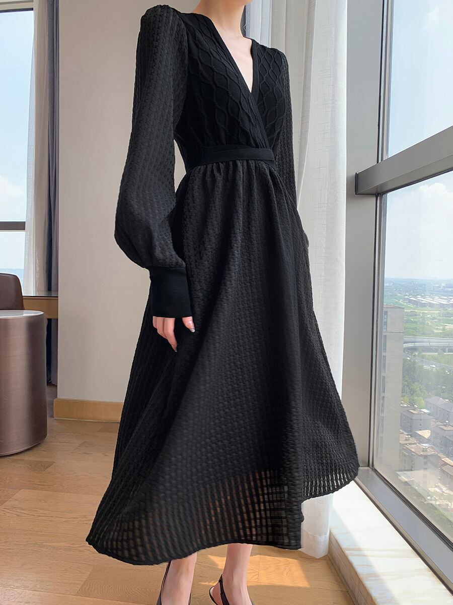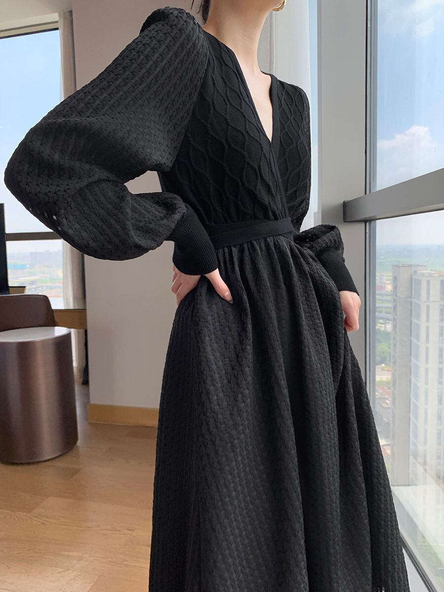 【送料無料】 ワンピース ロング ロング丈 袖あり 長袖 Vネック ハイウエスト ウエストリボン Aライン かわいい 大人可愛い きれいめ 大人 上品 おしゃれ お洒落 こなれ感 セクシー エレガント 主役級 存在感 フォーマル 無地 秋 20代 30代 40代 50代 レディース 女性用 OL 通勤 学生 通学 デート お出かけ 女子会 休日 着回し 普段使い 韓国 韓国系 オルチャン ファッション コーデ スタイル 楽ちん モテ 流行 インスタ映え S M L XL 黒 ブラック
