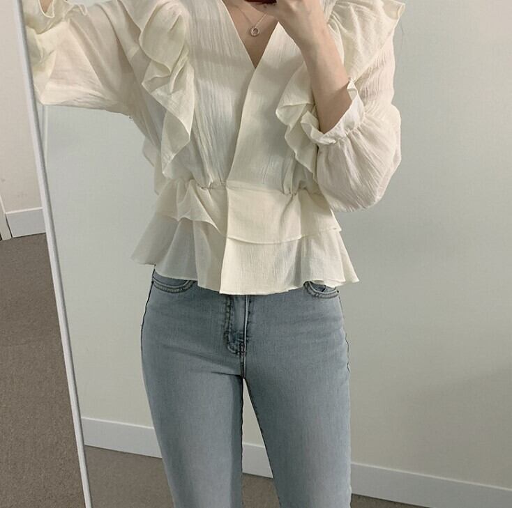 【送料無料】 トップス ブラウス ショート ショート丈 長袖 Vネック 甘め シフォン フリル かわいい 大人可愛い きれいめ おしゃれ お洒落 こなれ感 ラブリー キュート ガーリー 個性的 エレガント 主役級 存在感 フェミニン 無地 秋 10代 20代 30代 レディース 女性用 学生 通学 デート お出かけ 女子会 着回し 普段使い 韓国 韓国系 オルチャン ファッション コーデ スタイル モテ トレンド 流行 インスタ映え S M L XL 緑 グリーン ベージュ