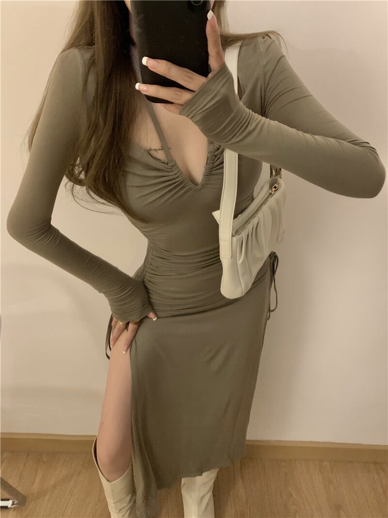 【送料無料】 ワンピース ロング ミディアム丈 スリット ホルターネック 長袖 肌見せ スリム タイト 細身 ハイウエスト 大人可愛い きれいめ おしゃれ お洒落 かっこいい こなれ感 個性的 クール セクシー エレガント 主役級 存在感 無地 春 秋 10代 20代 レディース 女性用 学生 通学 デート お出かけ 女子会 パーティー 着回し 普段使い 韓国 韓国系 オルチャン ファッション コーデ スタイル モテ 美脚 脚長 プチプラ トレンド 流行 インスタ映え ワンサイズ フリーサイズ グリーン