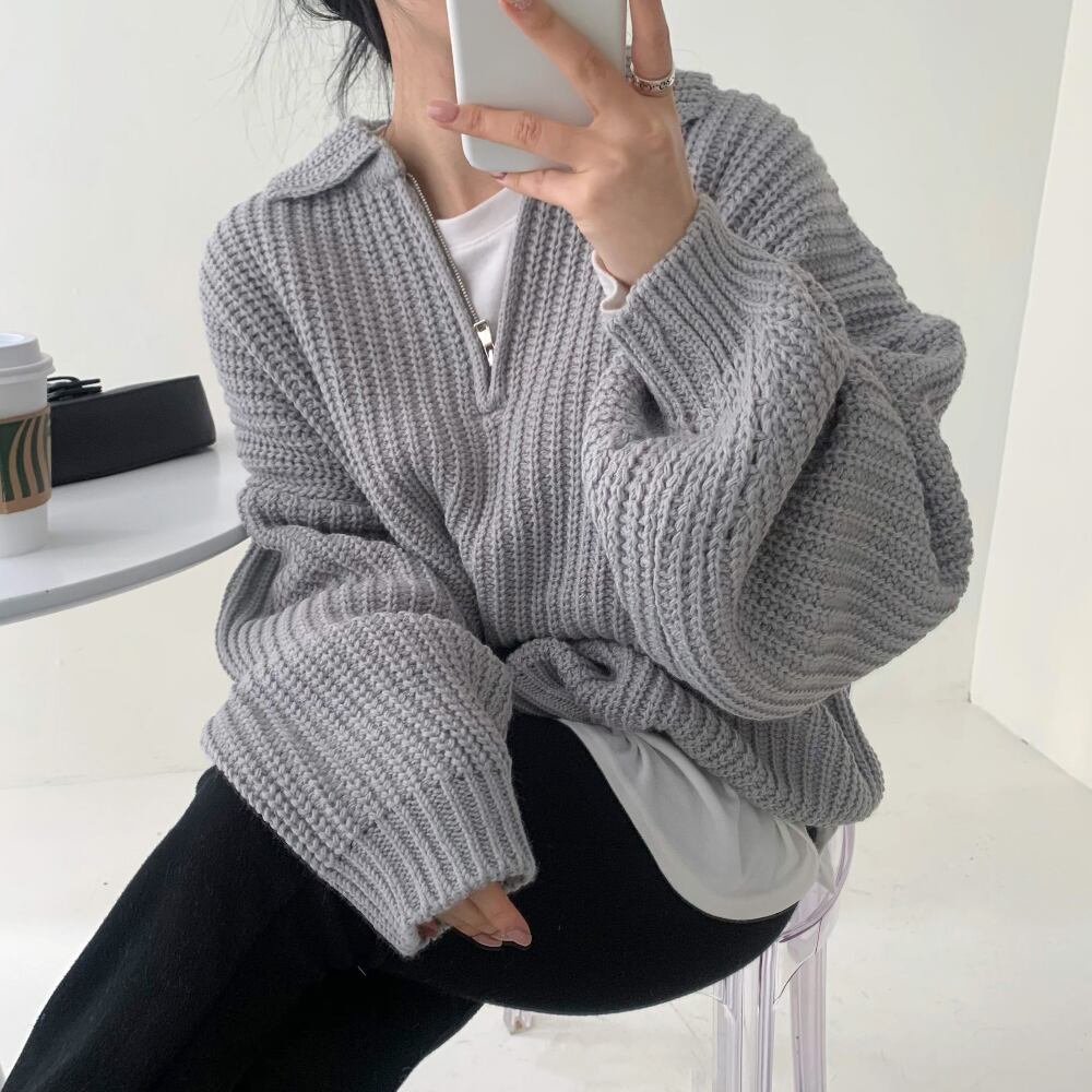 【送料無料】 トップス ニット セーター ミディアム丈 長袖 ランタンスリーブ 襟付き ハーフジップ かわいい 大人可愛い きれいめ シンプル カジュアル おしゃれ お洒落 こなれ感 ラフ ラブリー キュート 存在感 抜け感 フェミニン 無地 10代 20代 30代 レディース 女性用 通勤 学生 通学 デート お出かけ 女子会 着回し 普段使い 重ね着 韓国 韓国系 オルチャン ファッション コーデ スタイル インスタ映え トレンド プチプラ ワンサイズ フリーサイズ アプリコット ネイビー グレー