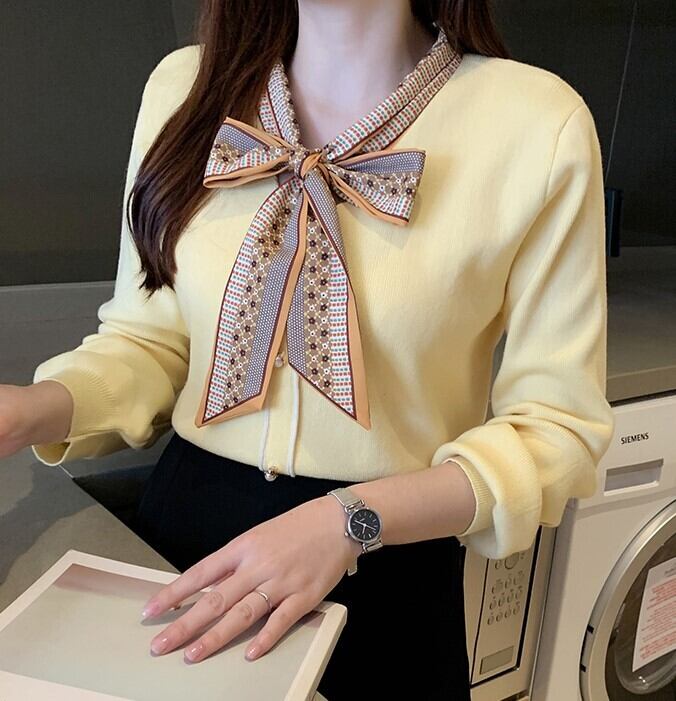 スカーフのボウタイで顔回りを華やかにみせてくれるニットトップスです。