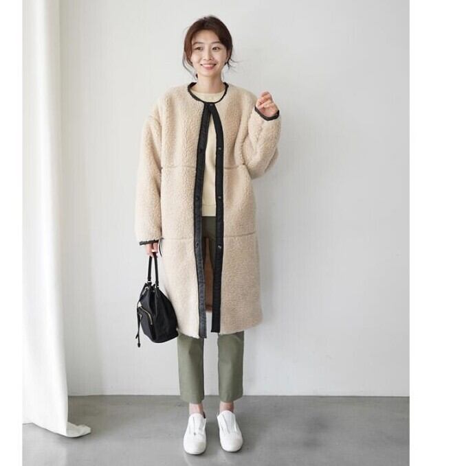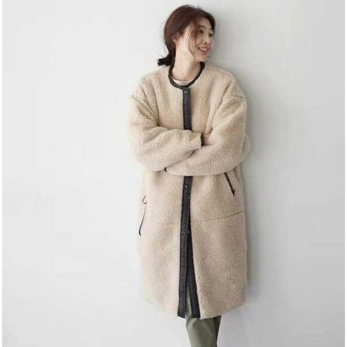 ボア素材でカジュアル感がありながら、ヒップまであるミドル丈に首もとはスッキリとしたノーカラーで大人女性の上品さをアピール。