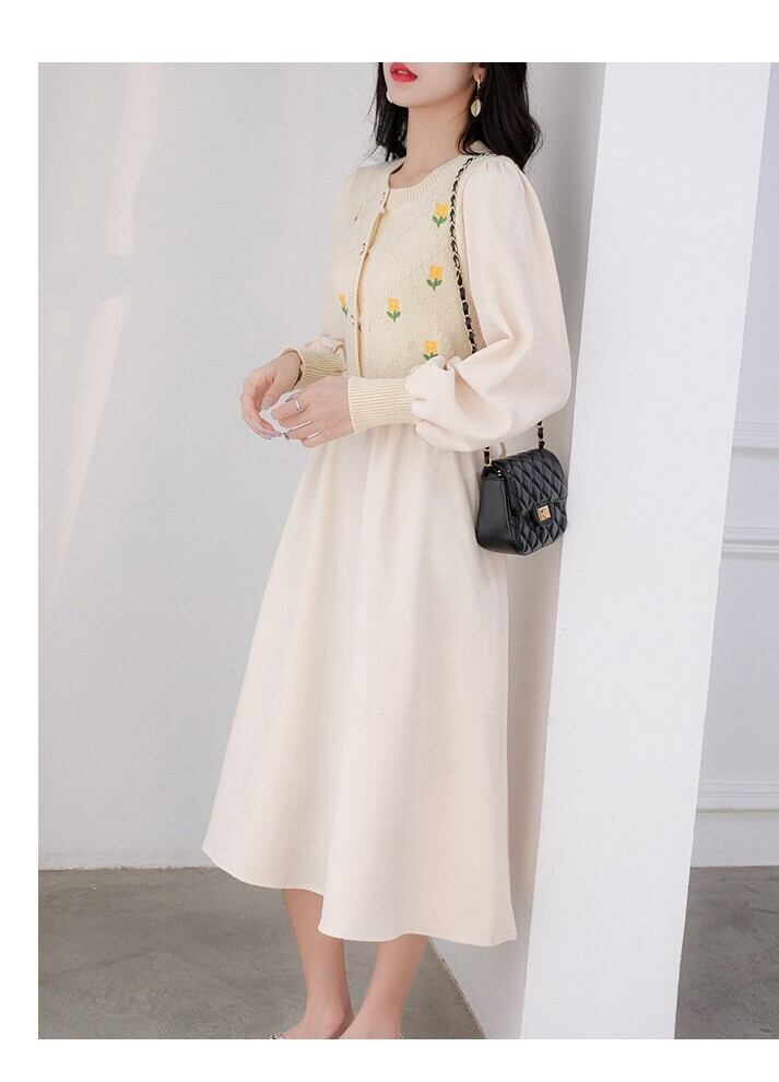 【送料無料】 ワンピース ニット ミモレ丈 ひざ丈 長袖 ラウンドネック ハイウエスト かわいい 大人可愛い きれいめ おしゃれ お洒落 レトロ こなれ感 ラフ ラブリー キュート ガーリー 主役級 存在感 抜け感 フェミニン 花柄 フラワー 秋 冬 10代 20代 レディース 女の子 学生 通学 デート お出かけ ショッピング お呼ばれ 女子会 着回し 普段使い 韓国 韓国系 オルチャン ファッション コーデ スタイル 体型カバー トレンド 流行 インスタ映え S M L XL ホワイト